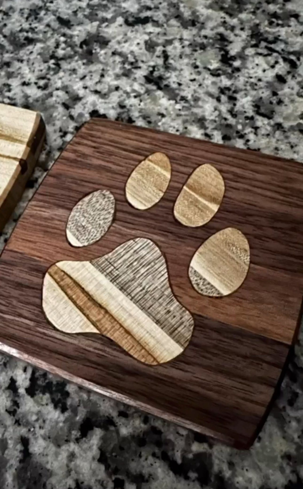 By Admin12 / June 27, 2025 Pawsome coasters. Sets of stripped American black walnut and ambrosia maple with contrasting paws inlayed cut from the same.