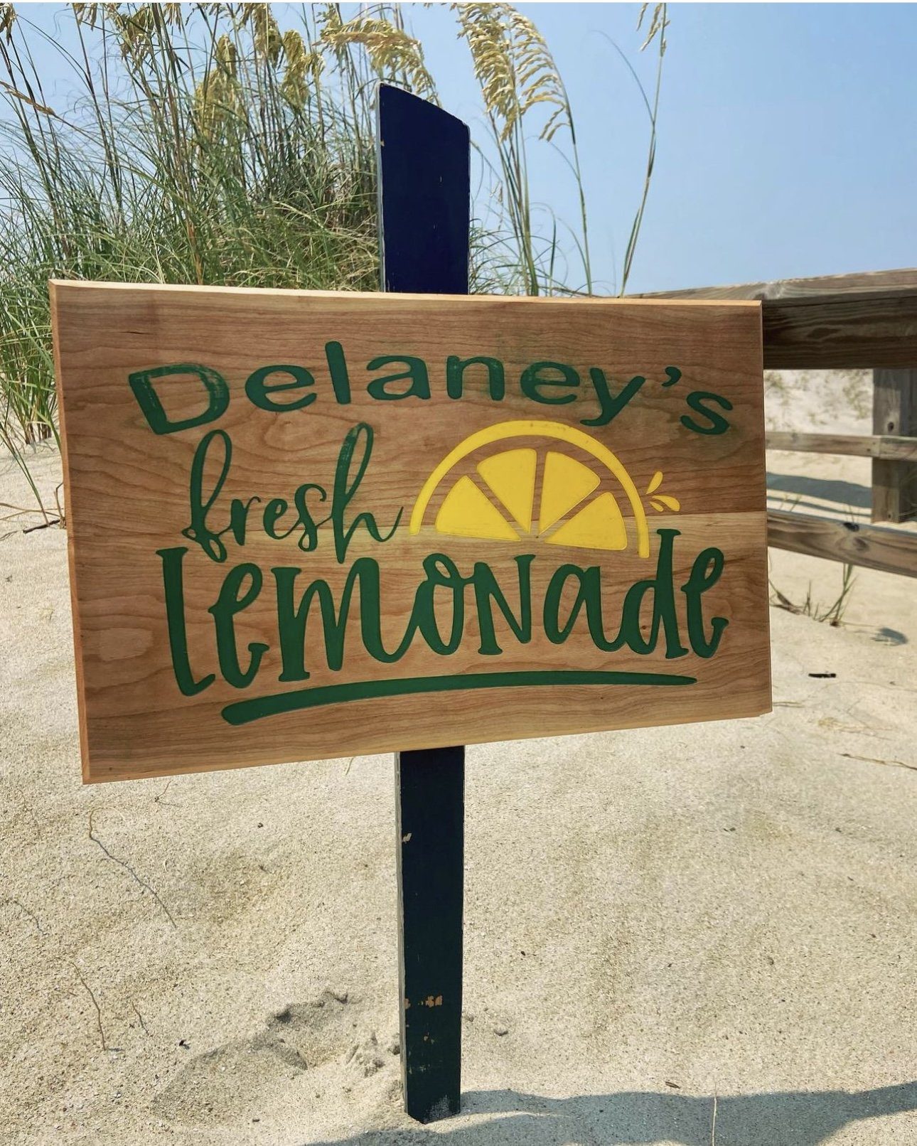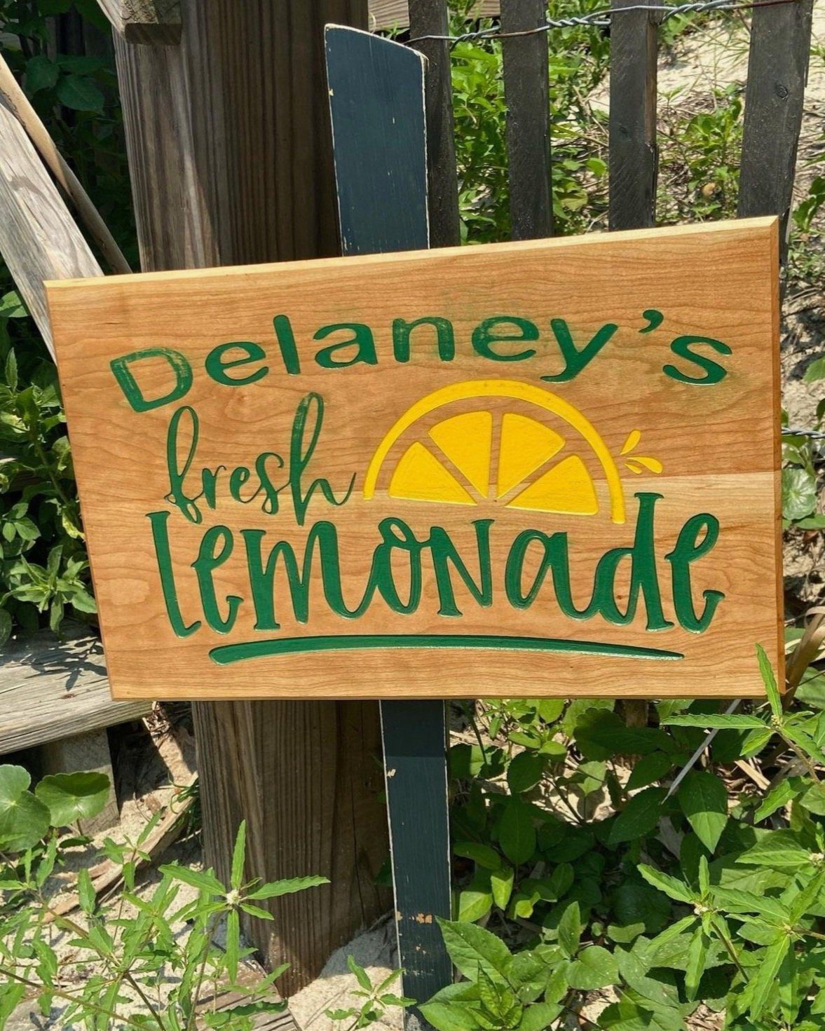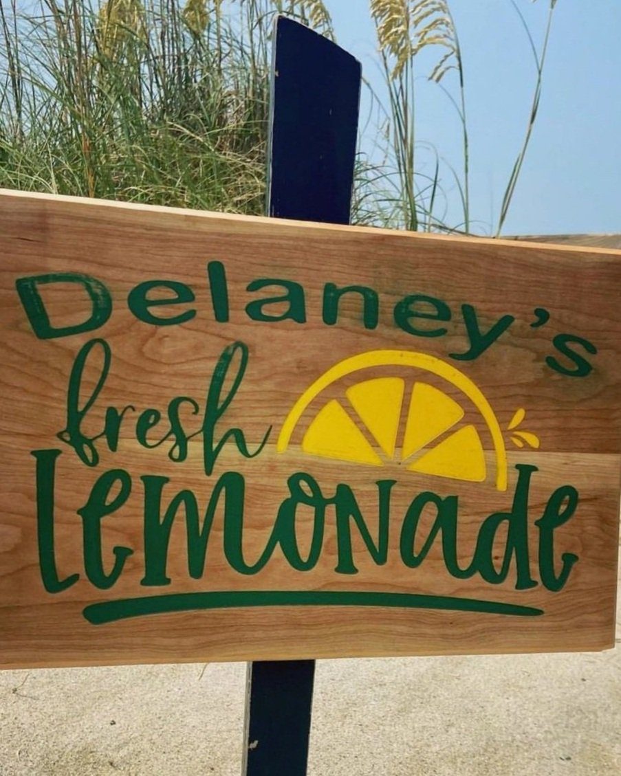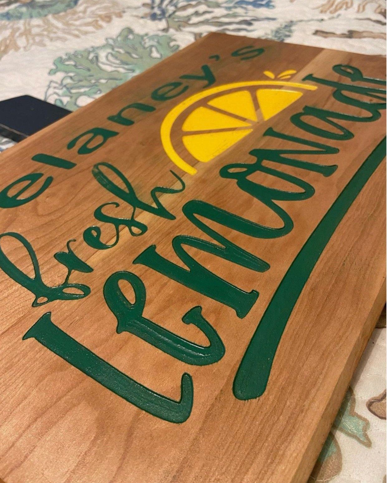 for D, one of my Favorites! Hardwood engraved lemonade sign in flamed cherry. Backfilled with green and yellow acrylics before distress.