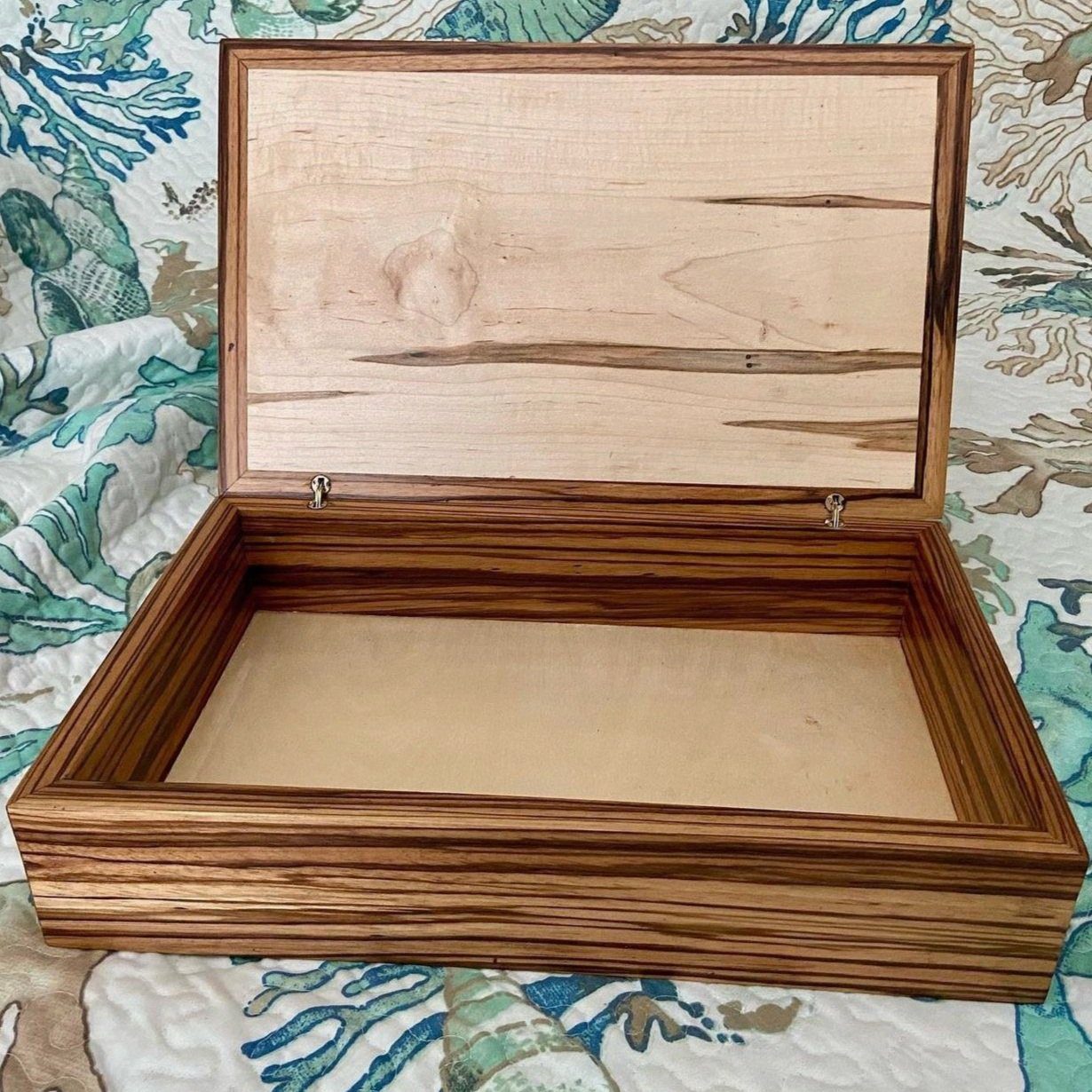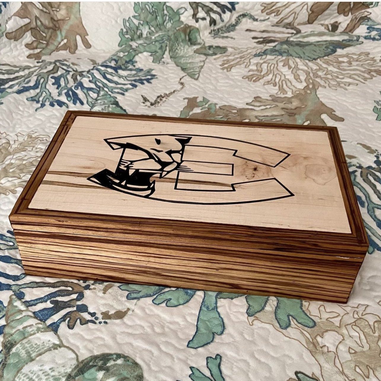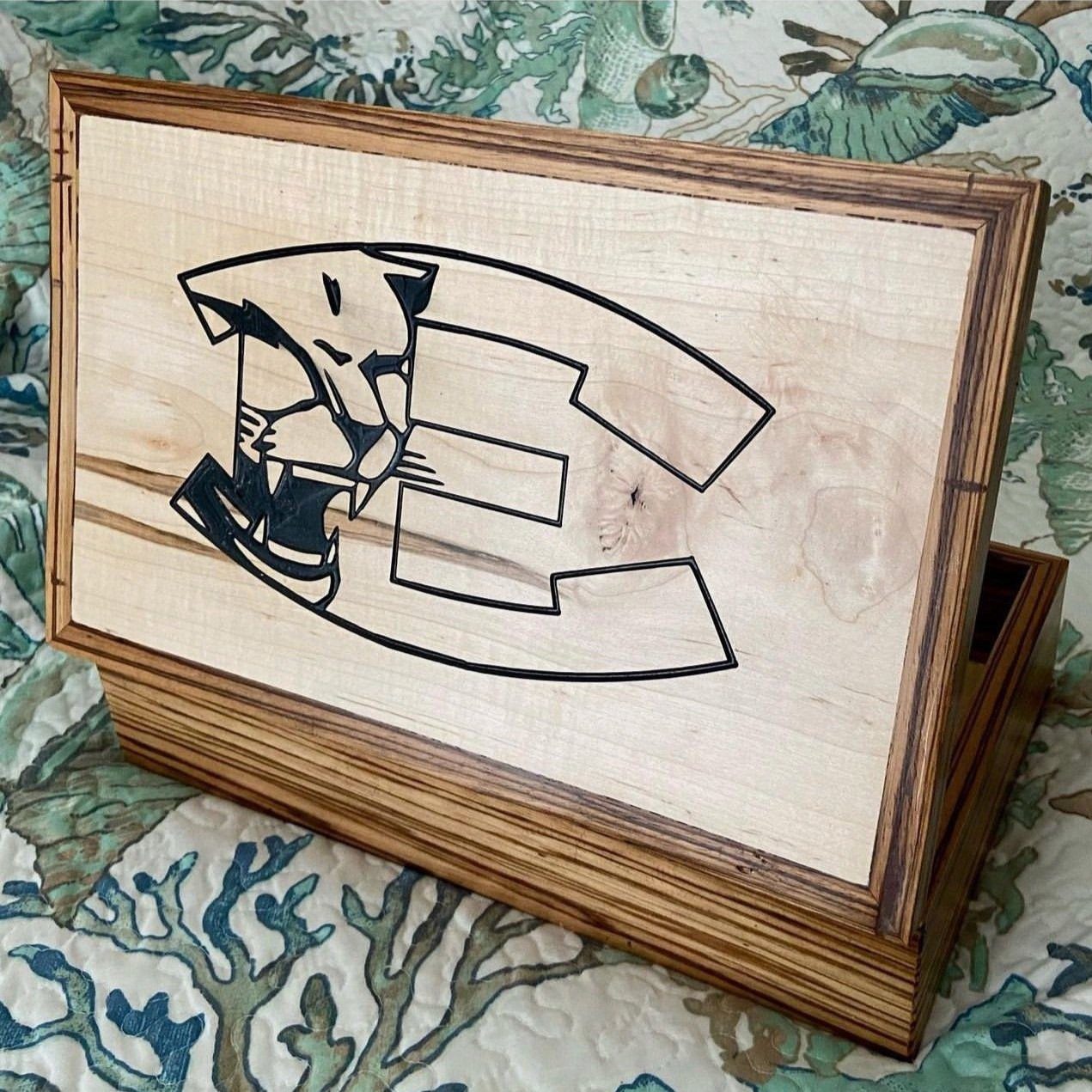 Ambrosia maple panels wrapt in Zebrawood. Engraved acrylic design.