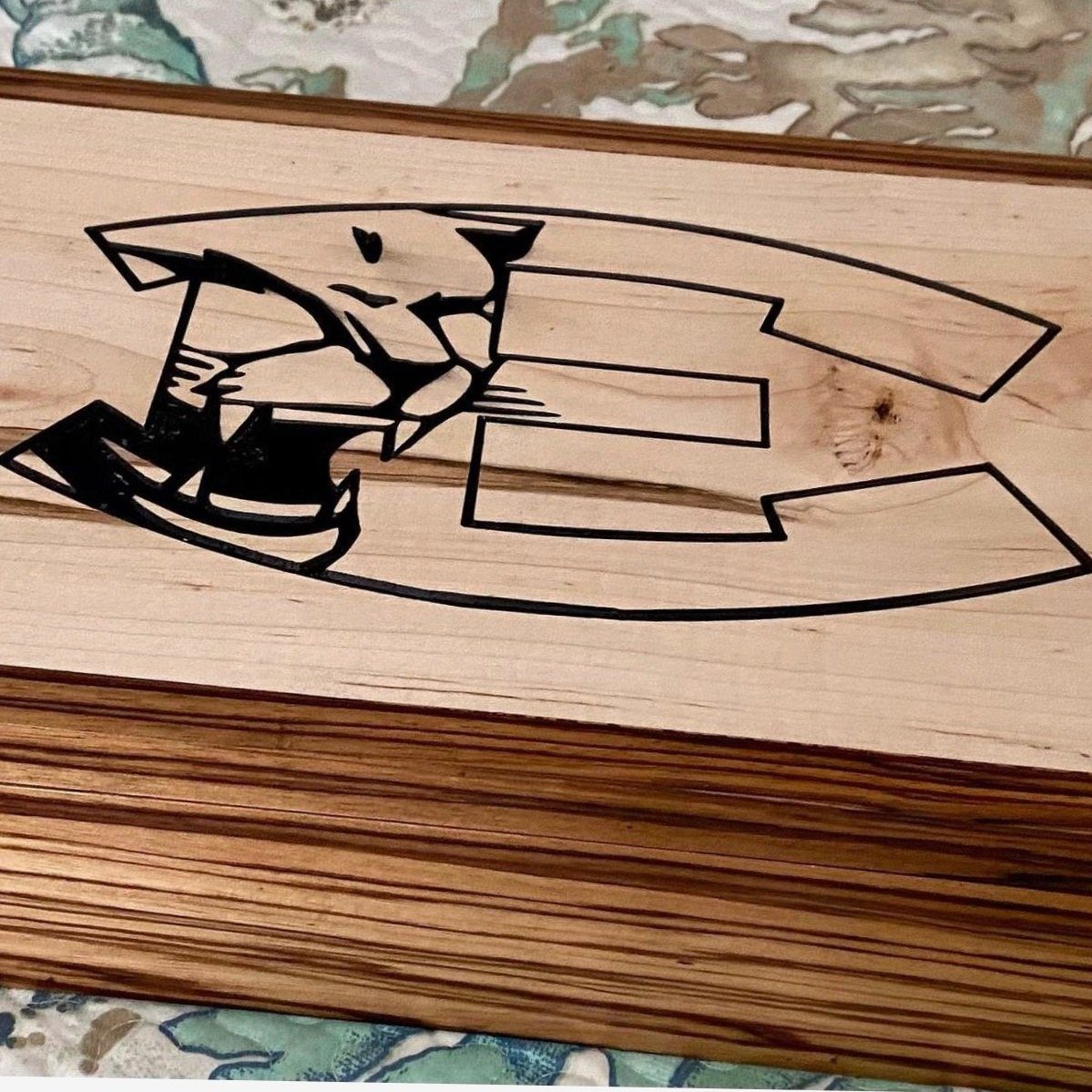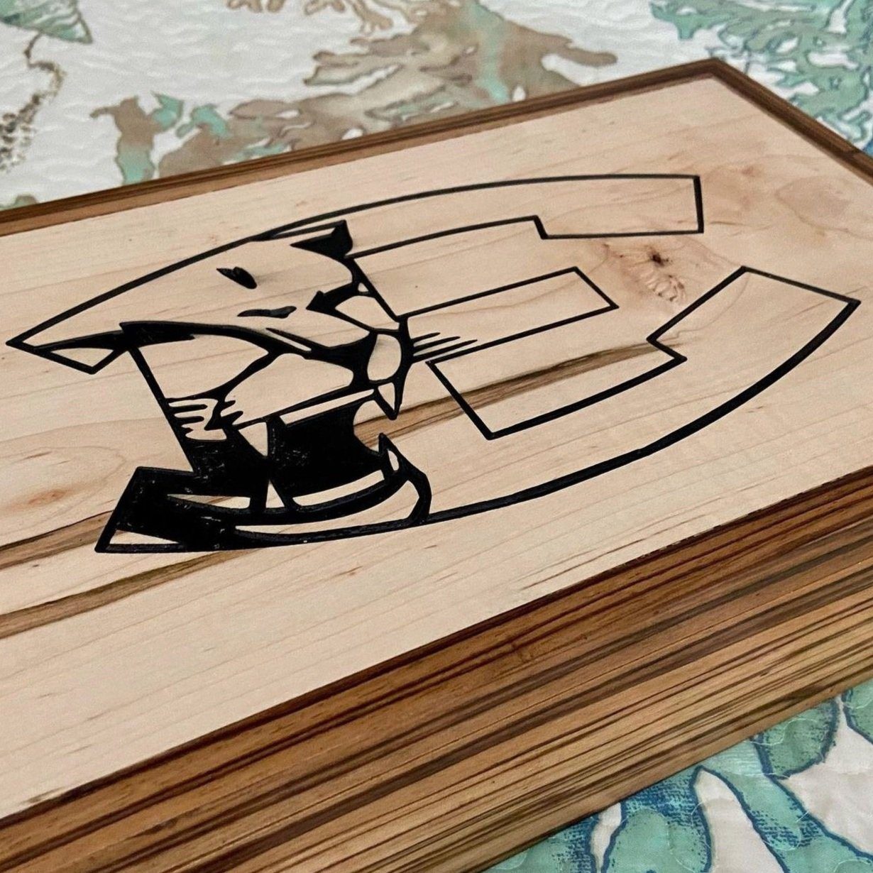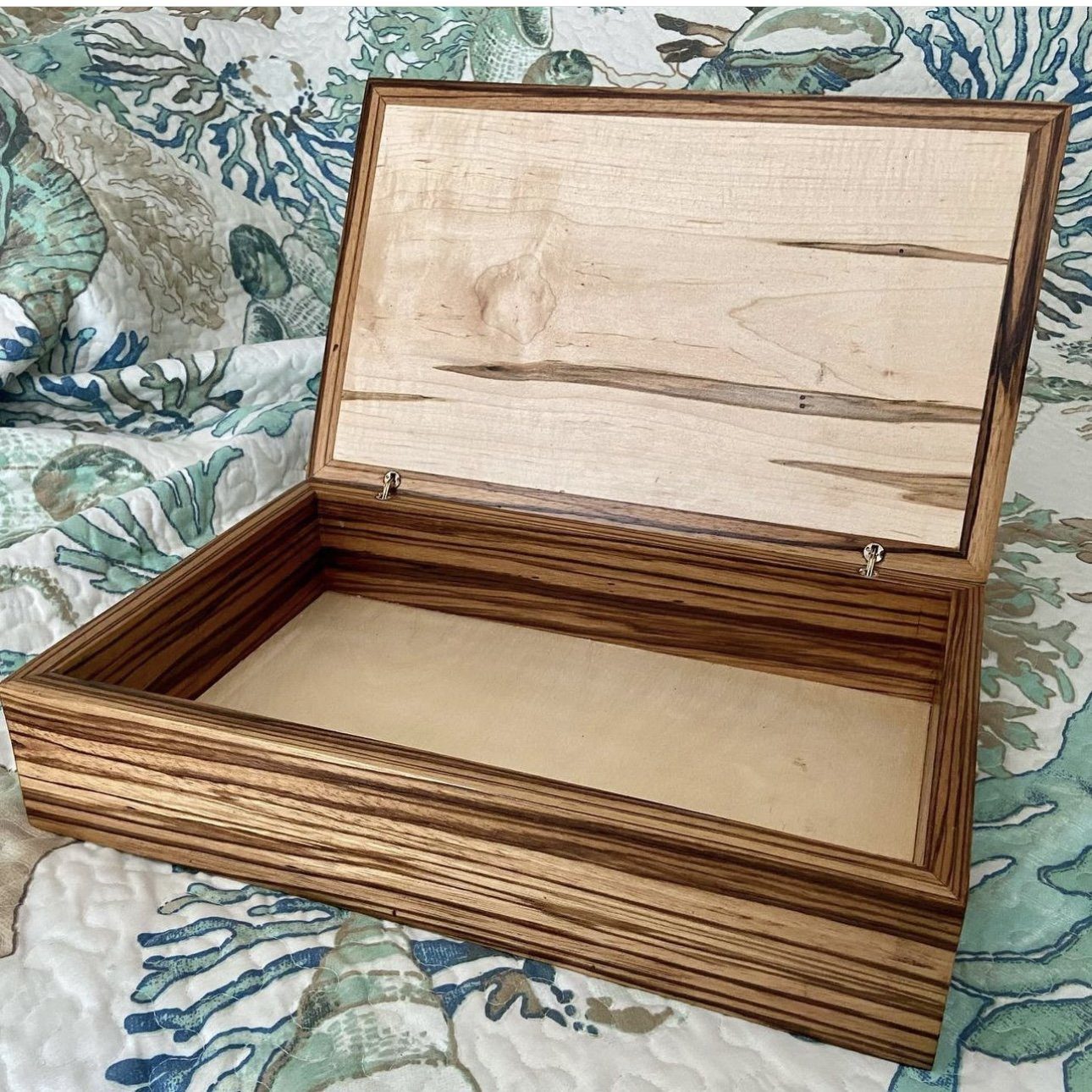 Ambrosia maple panels wrapt in Zebrawood. Engraved acrylic design.