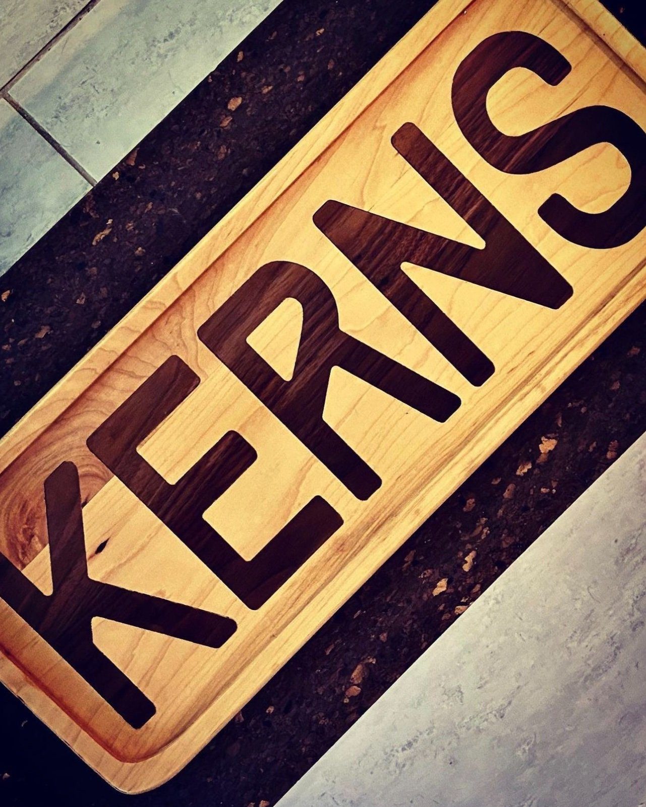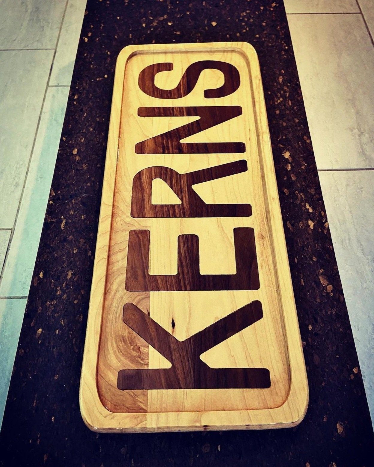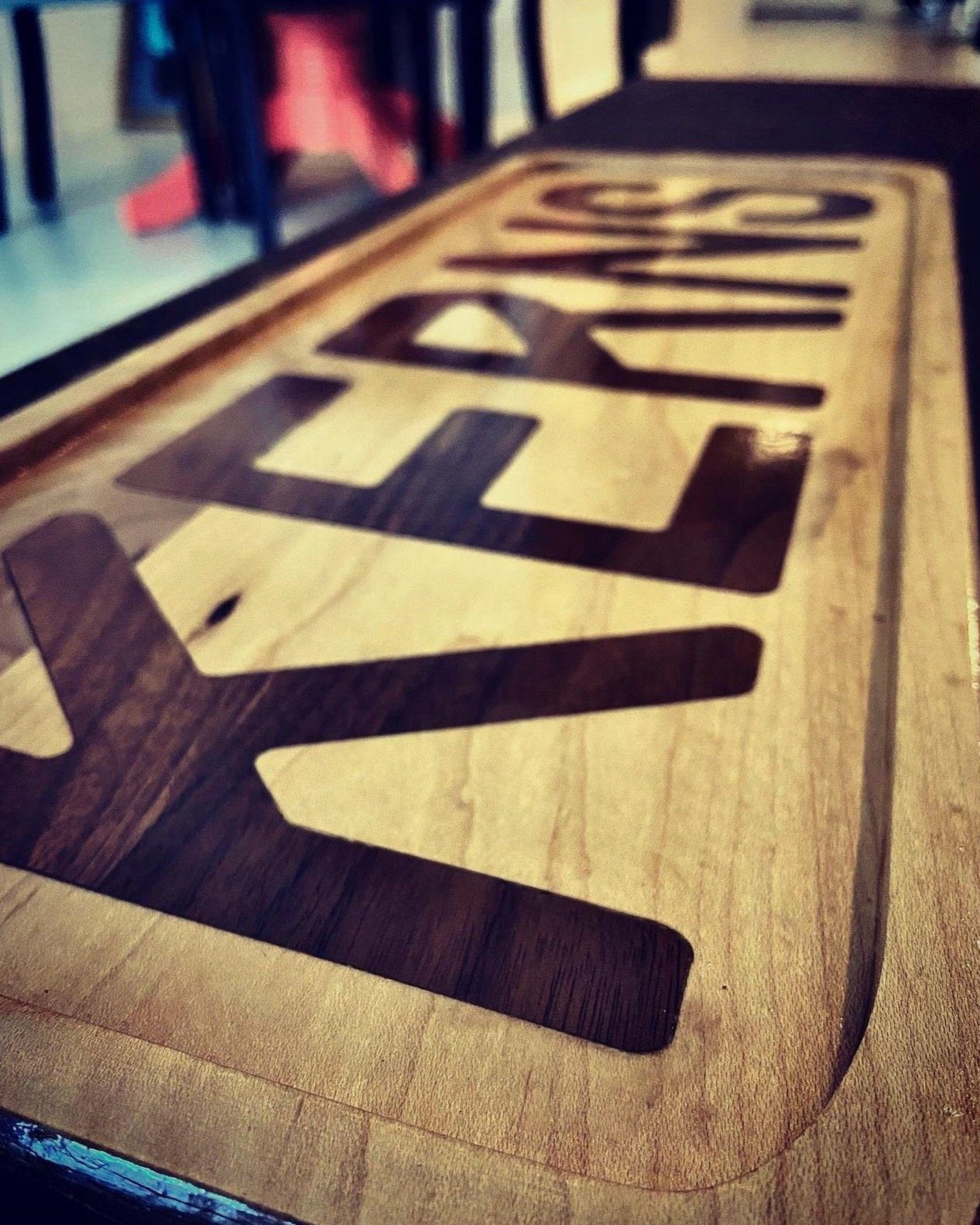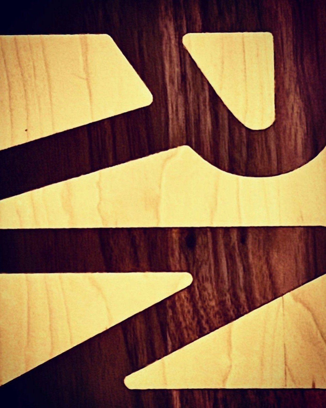 American Black Walnut inlayed into hard maple. cut with continuous grain flow.