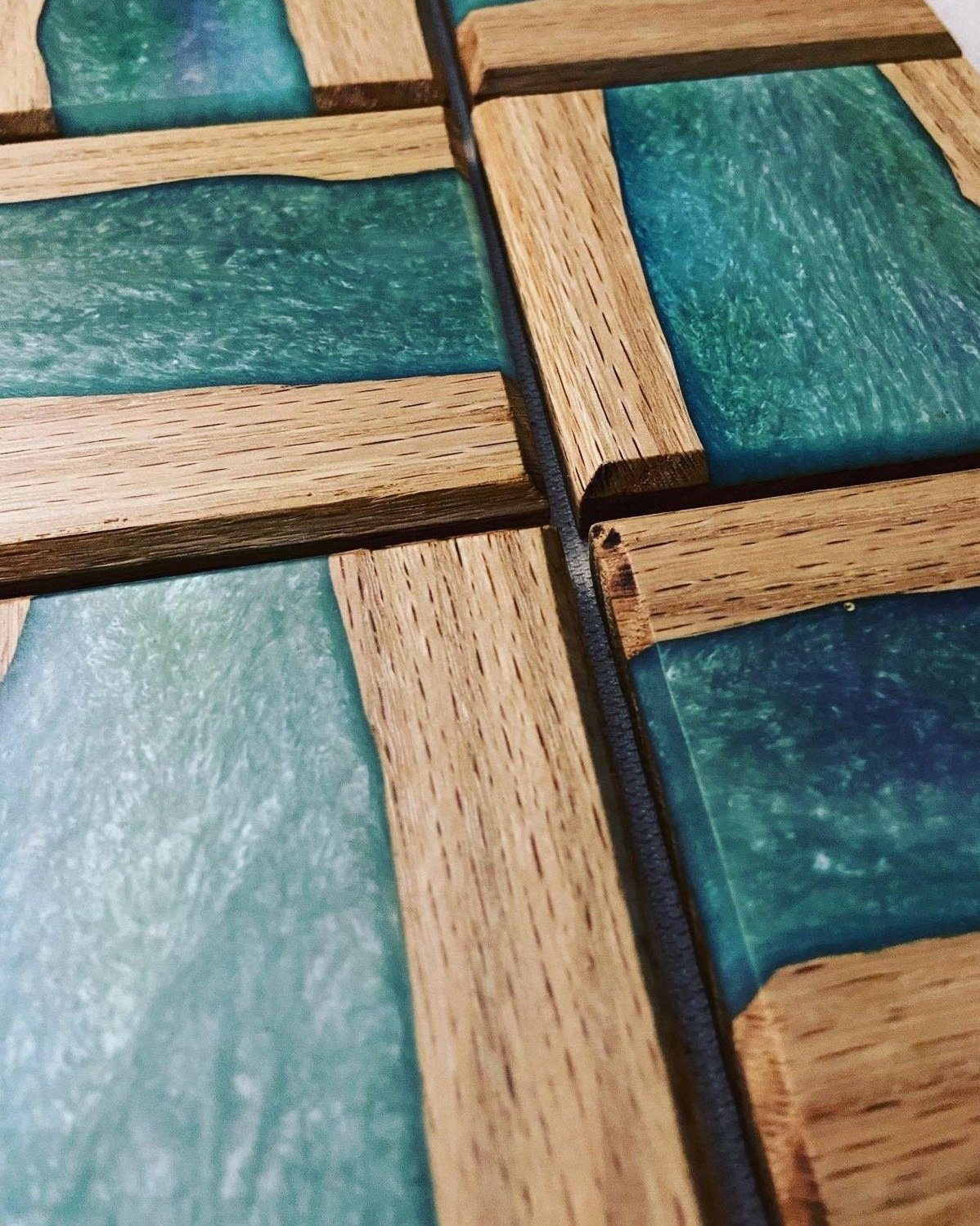 By Admin12 / June 26, 2025 color coasting. These oak and acrylic coaster sets were made as a colorful addition for a client’s entertainment area. Each coaster highlights the natural beauty of red oak, enhanced by a bold acrylic river design.
