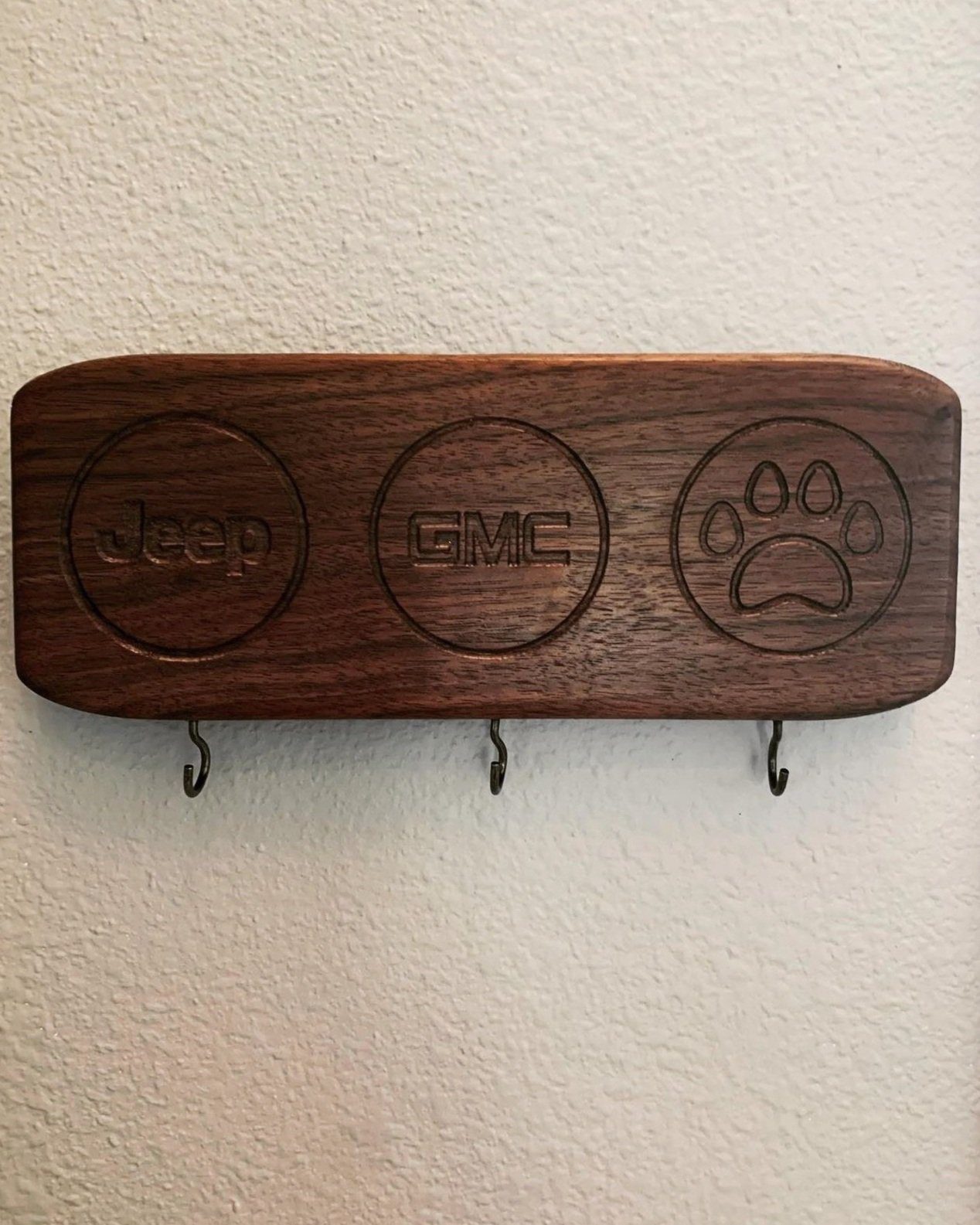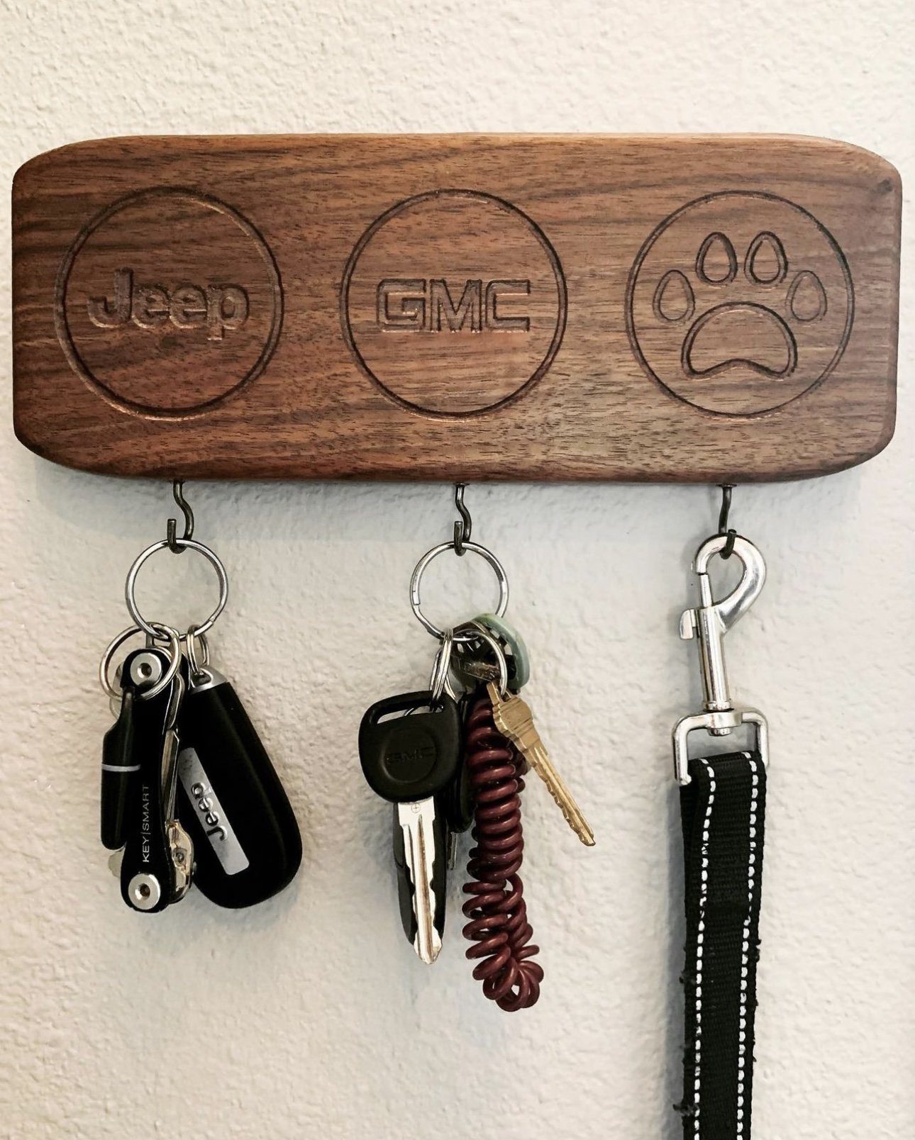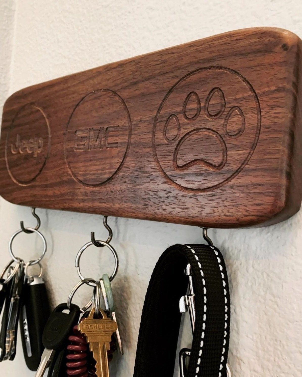 Engraved black walnut key and leash holder for wall mounting.