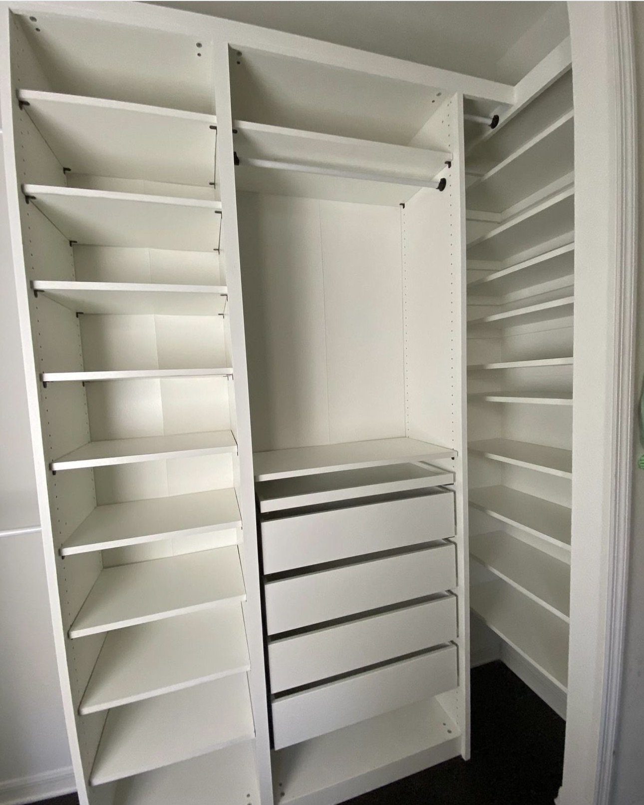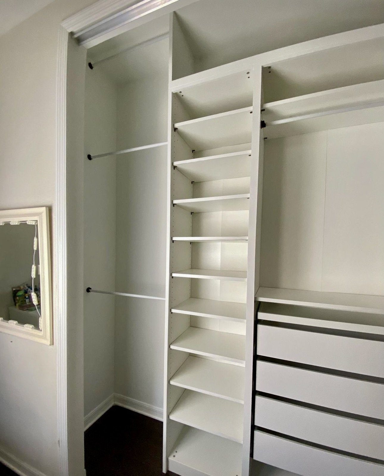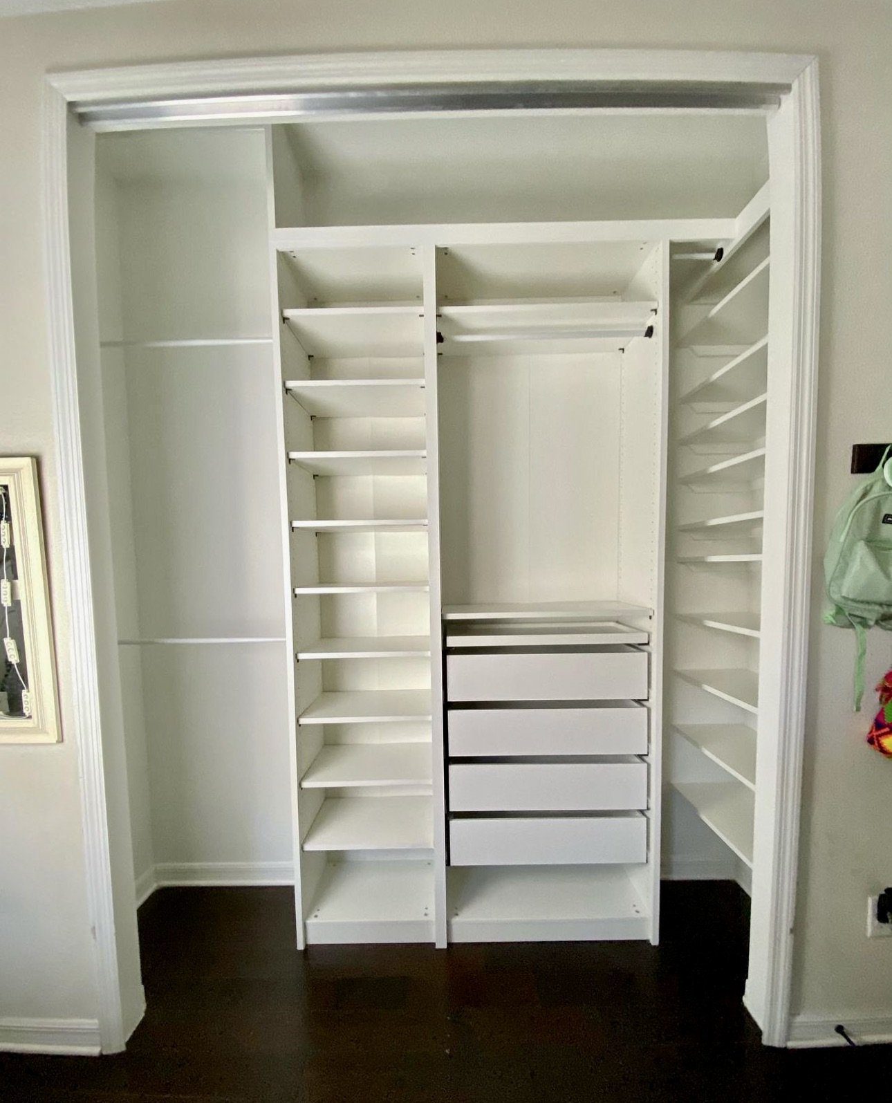 Reach in Closet remodel, pax base. This closet remodel featured an efficient storage solution with an array of custom shelves, drawers, and compartments, offering ample space for organizing clothes, accessories, and more, while optimizing every inch of the space.