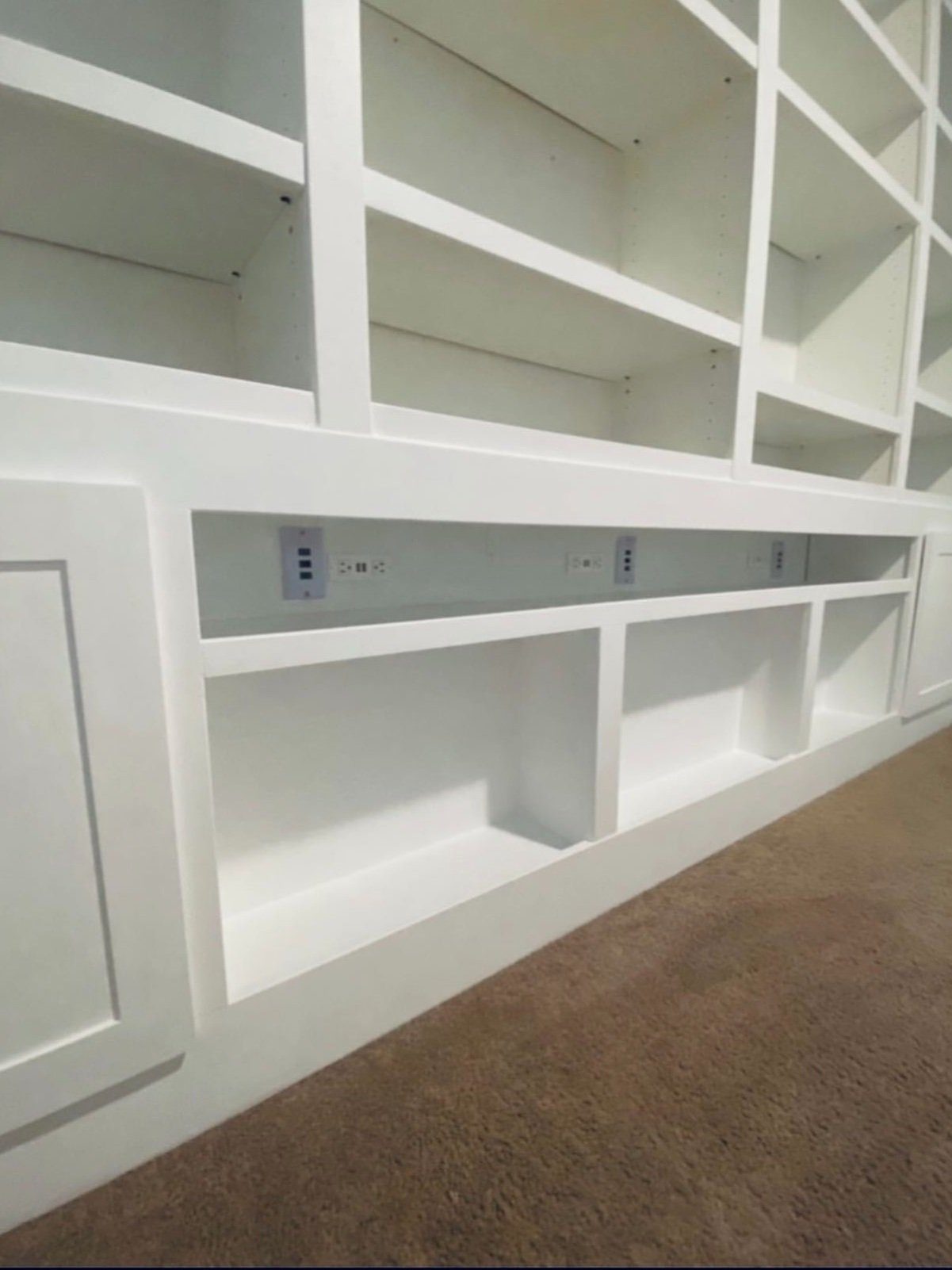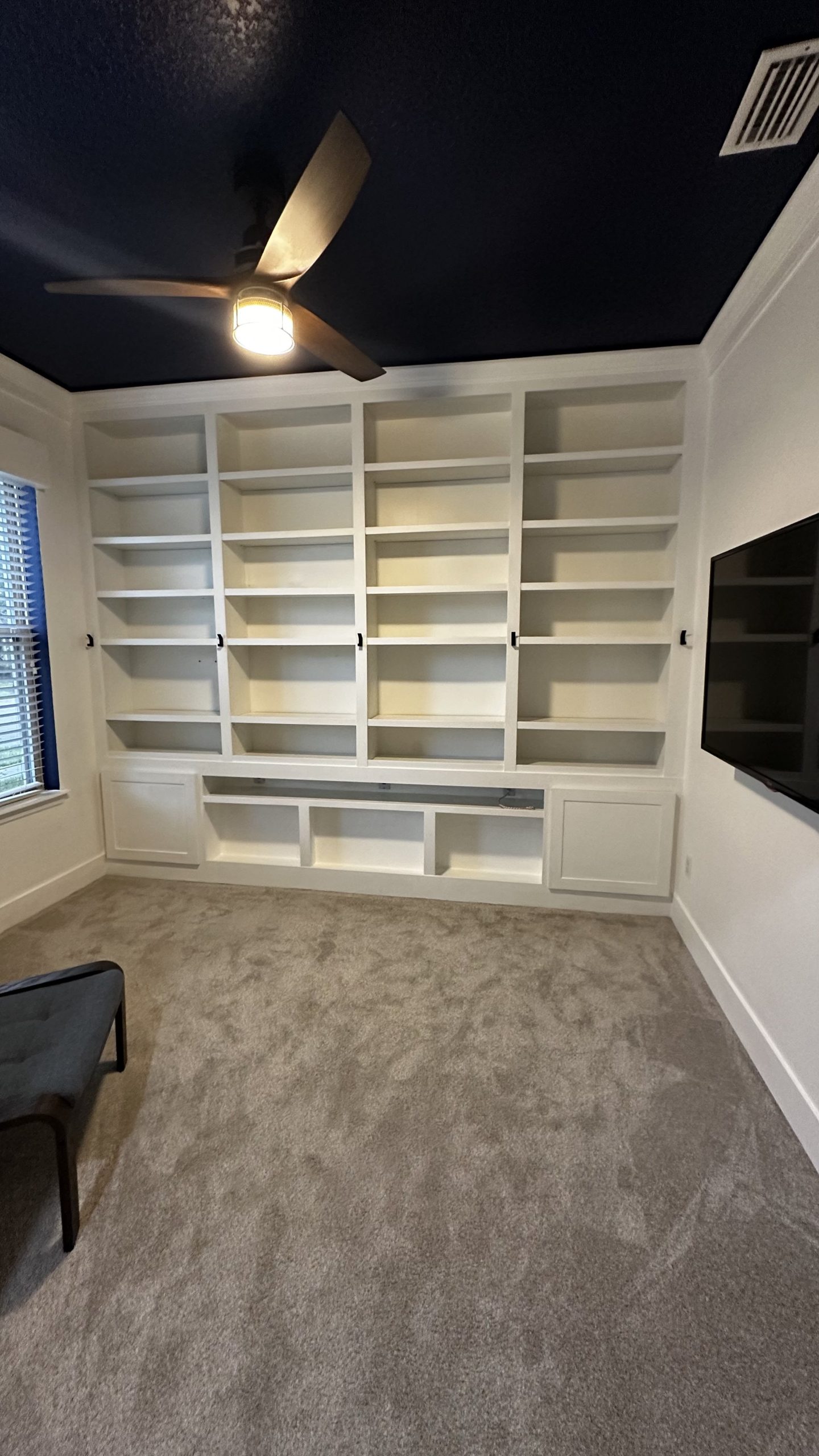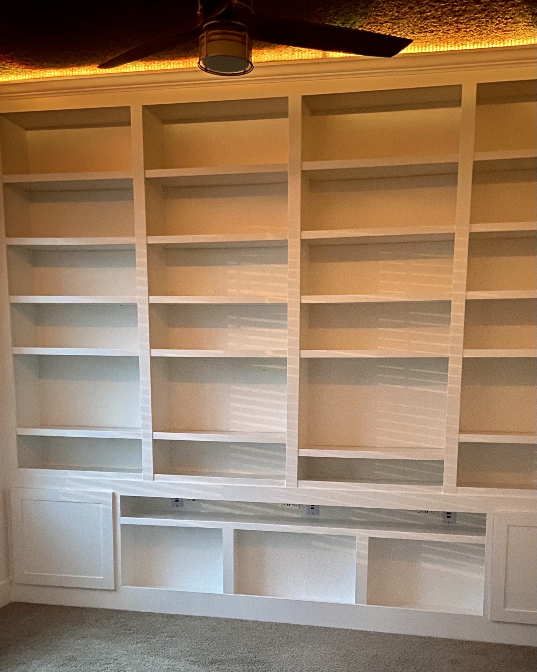Full floor-to-ceiling, wall-to-wall built-in bookshelf with adjustable shelves, smart shelf featuring charging ports and 12 inputs. Additional charging and media inputs are integrated into the cabinet doors. Recessed crown molding with hidden RGB LED lighting.