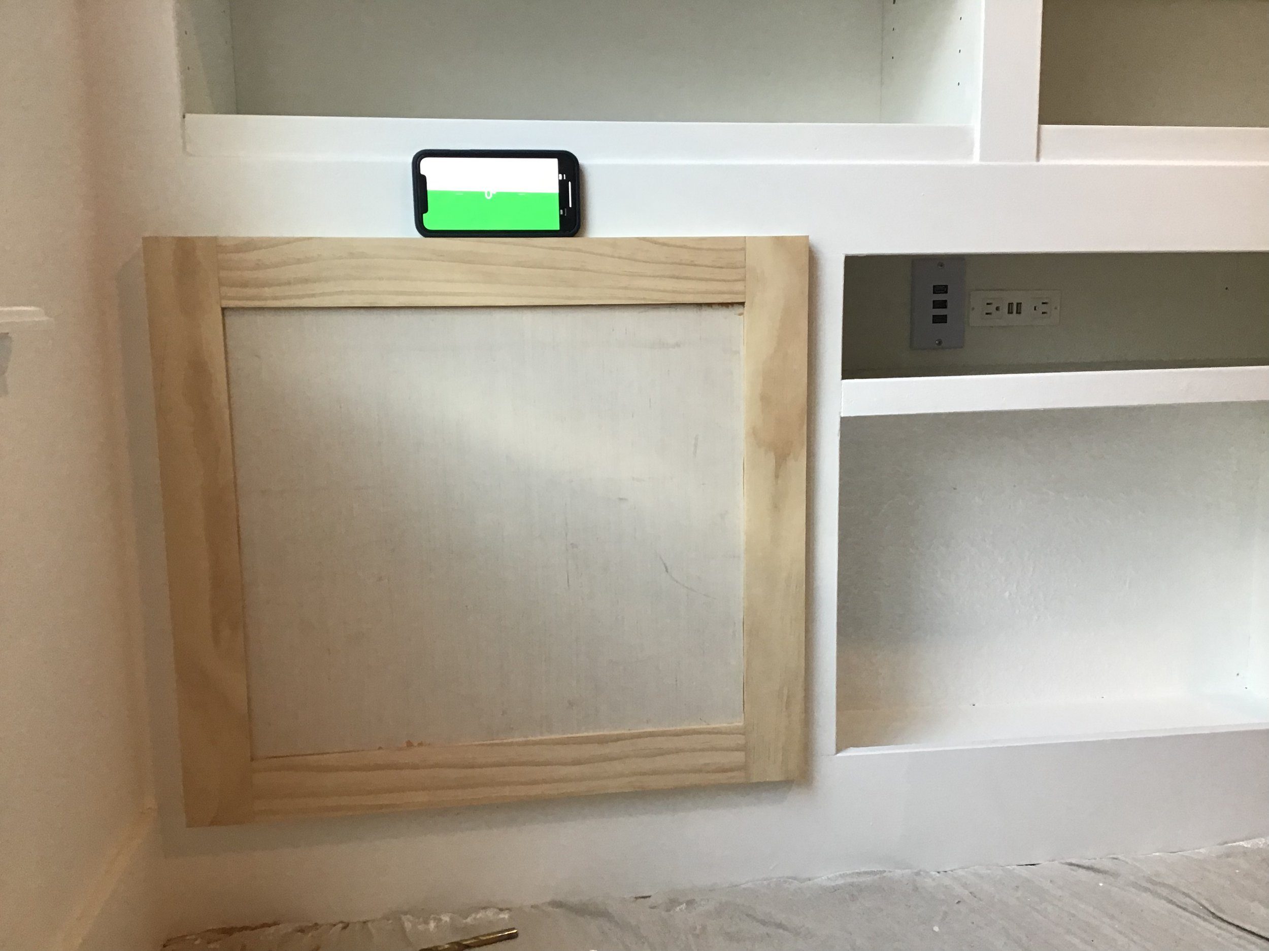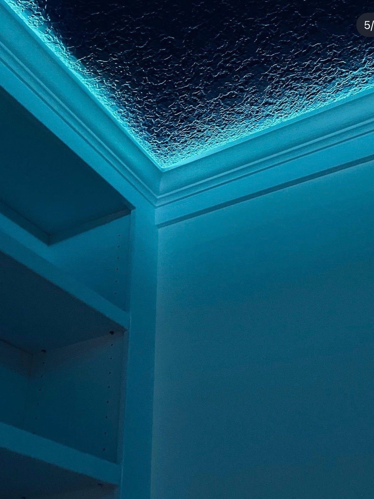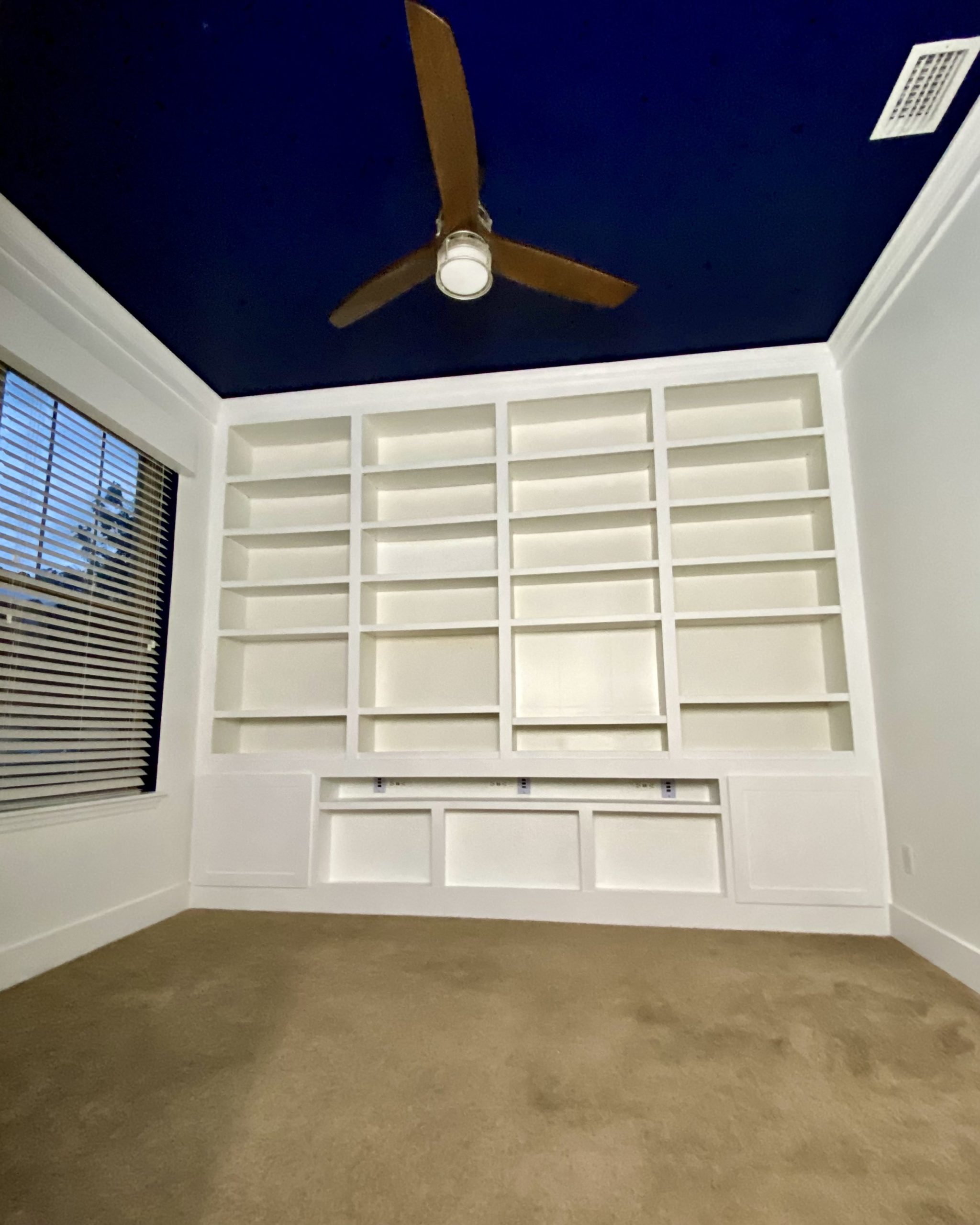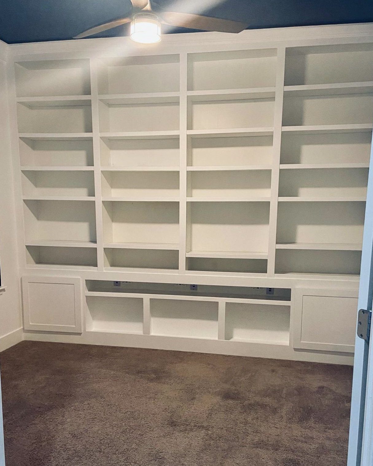 Full floor-to-ceiling, wall-to-wall built-in bookshelf with adjustable shelves, smart shelf featuring charging ports and 12 inputs. Additional charging and media inputs are integrated into the cabinet doors. Recessed crown molding with hidden RGB LED lighting.
