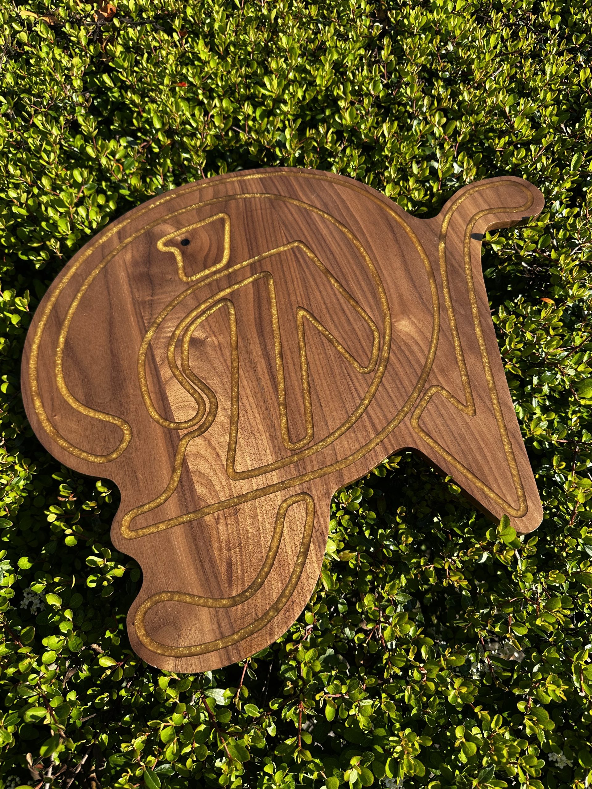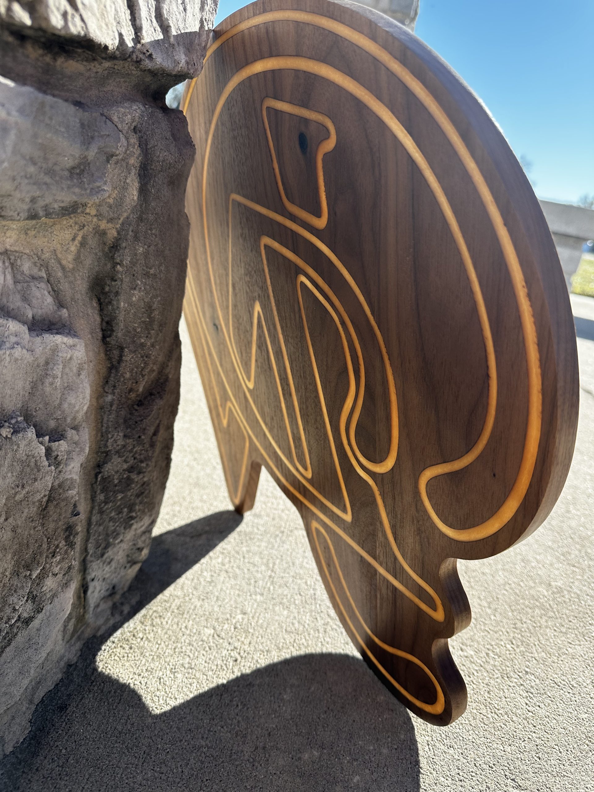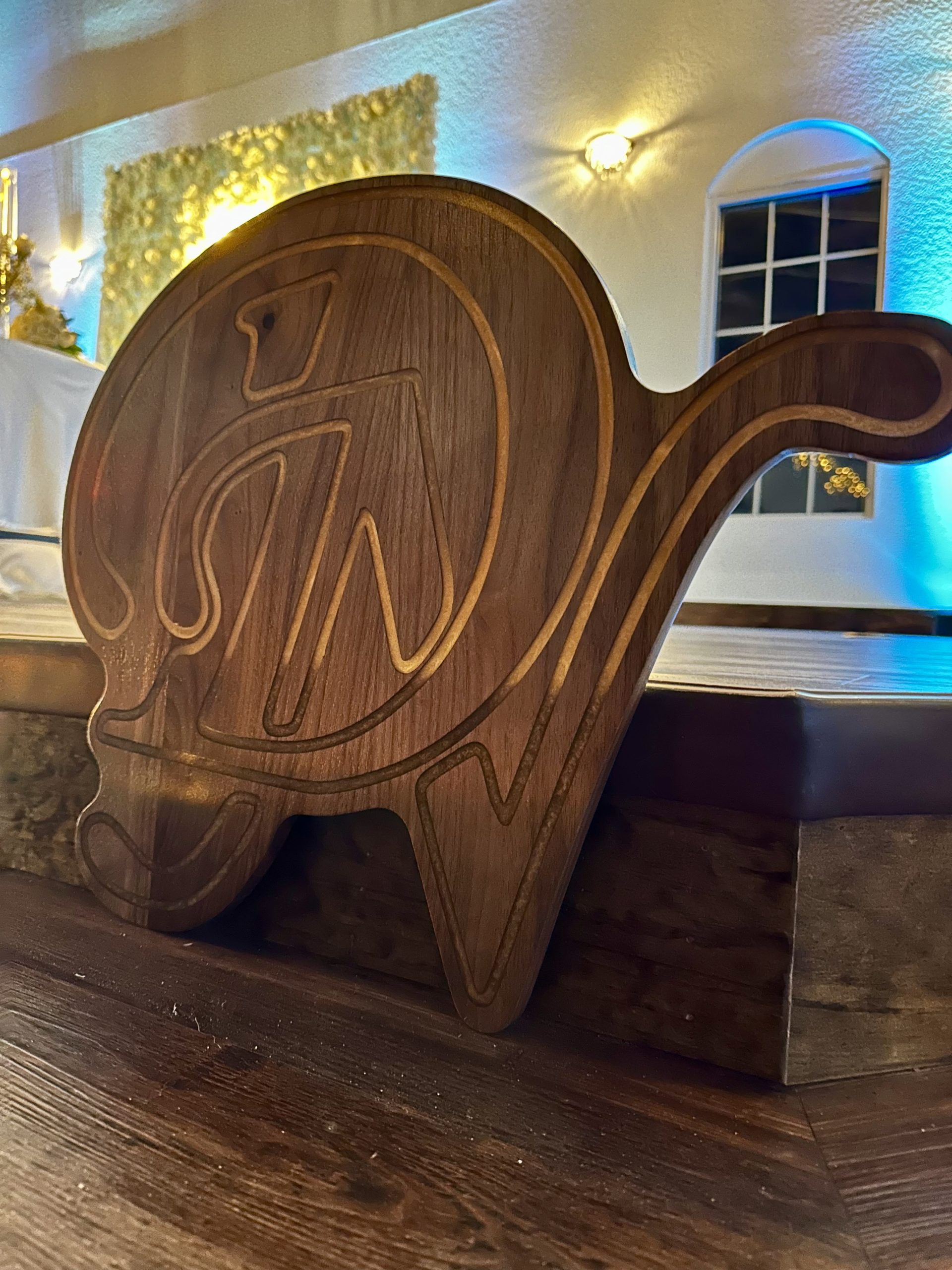 This companion piece is made from paneled American black walnut, with the bride and groom’s initials outlined in front-to-back transparent gold acrylic.