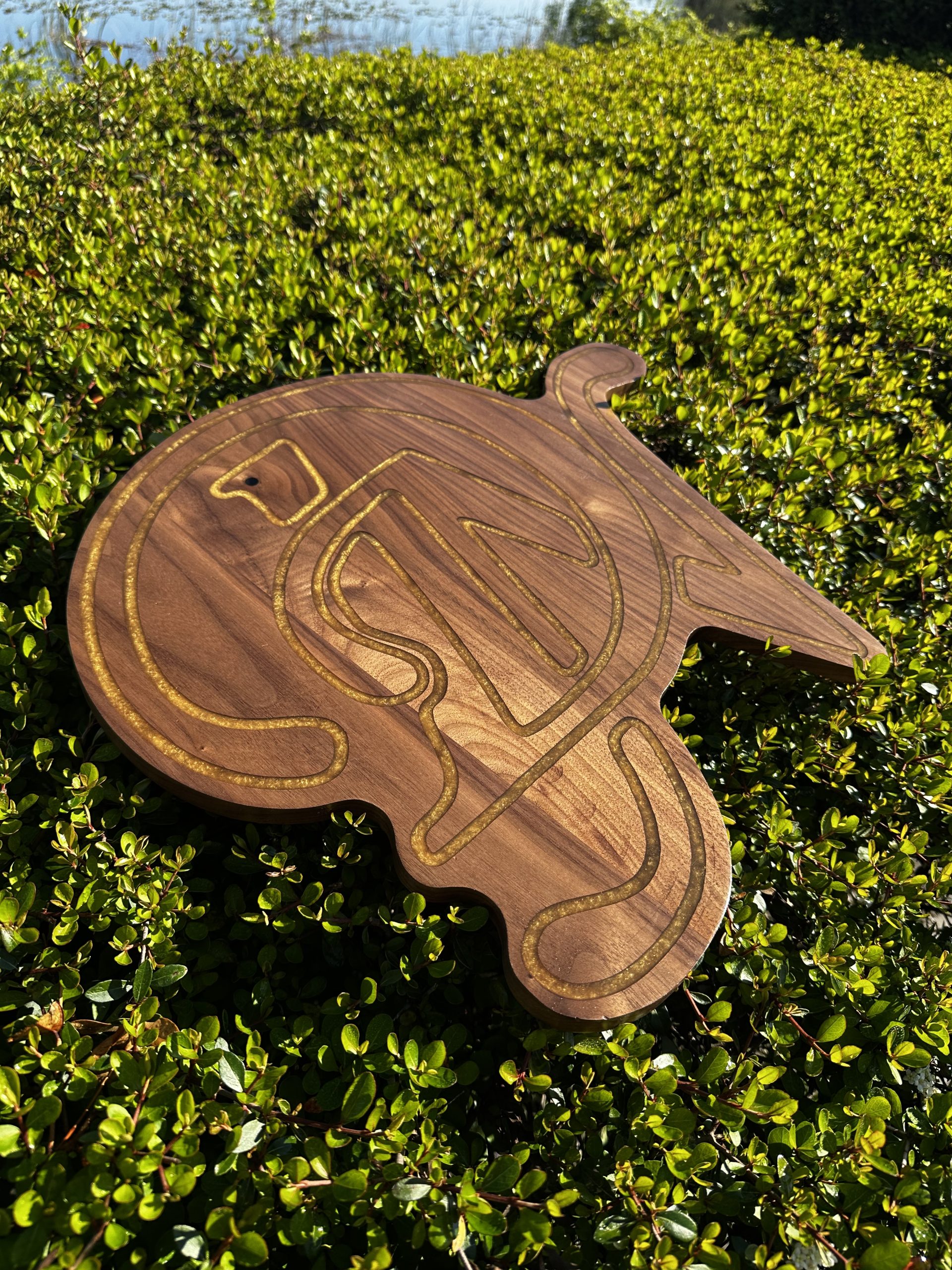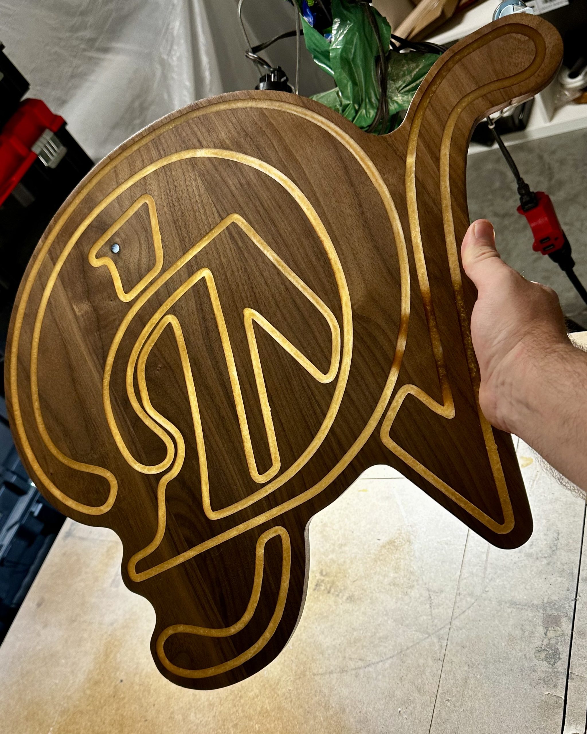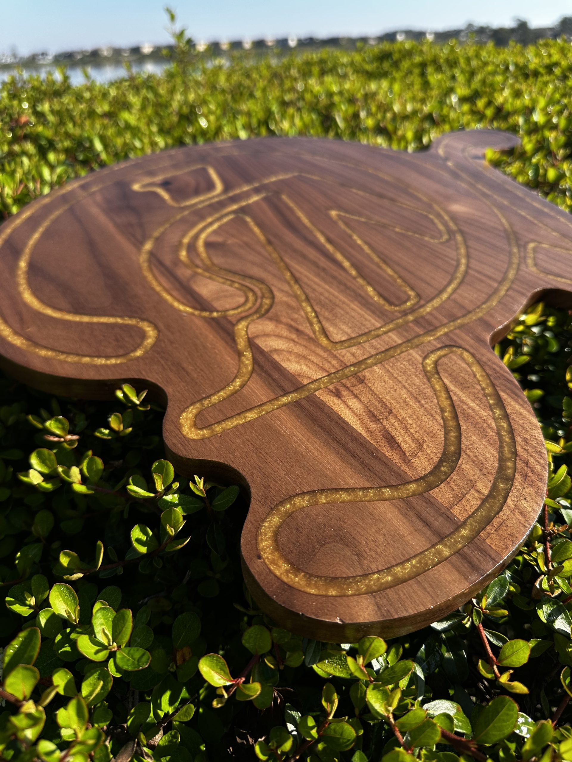 This companion piece is made from paneled American black walnut, with the bride and groom’s initials outlined in front-to-back transparent gold acrylic.