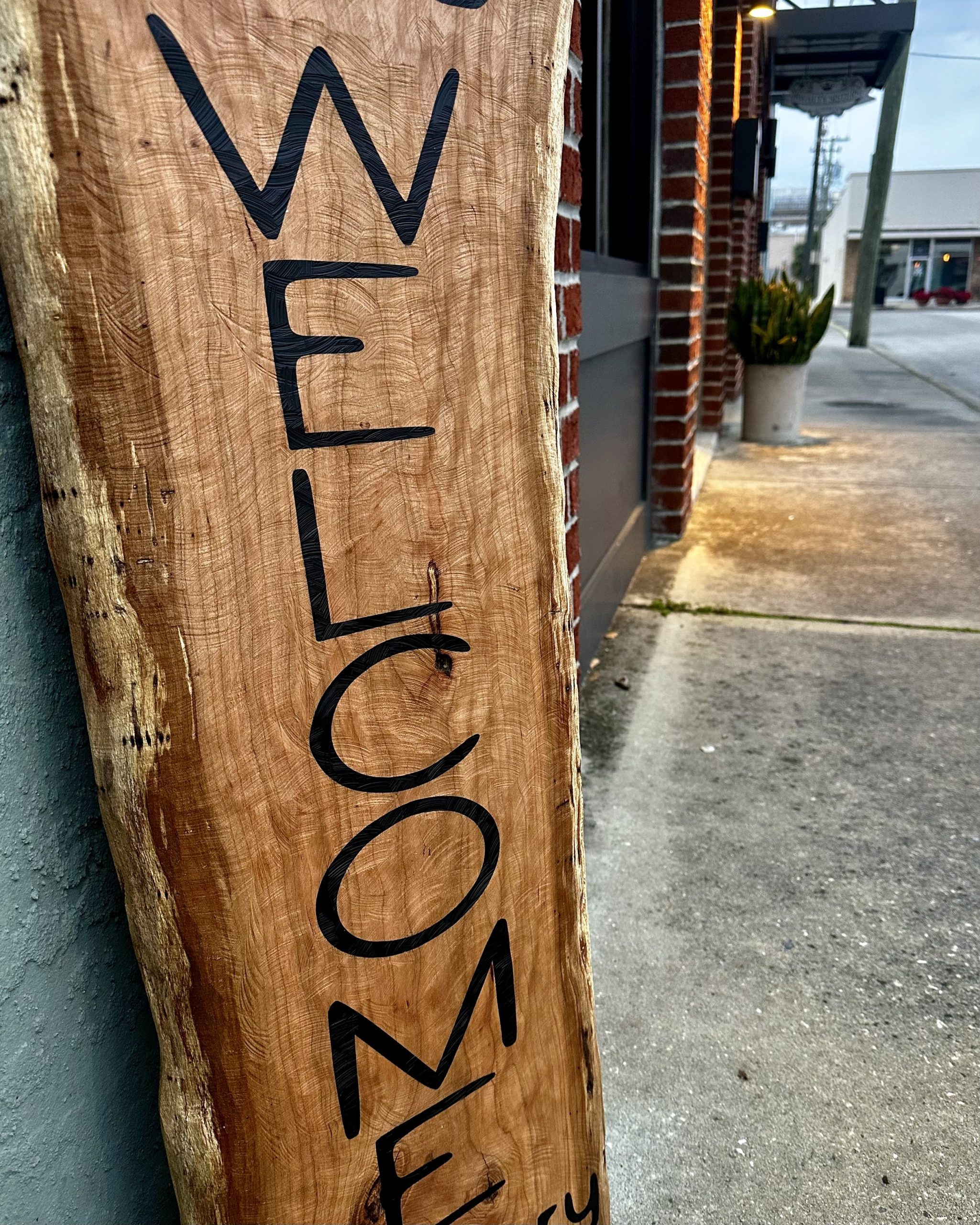 By Admin12 / June 27, 2025 Welcome, home. Power carved welcome sign with address. Made of a reclaimed Cherry Slab inlaid with black acrylic.